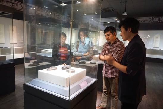 柳州博物馆馆长陈州(右一)正在解说历史文物