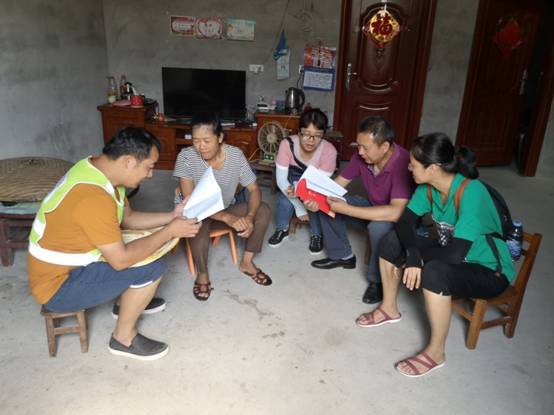 向帮扶对象蓝金艳(左2)宣传扶贫政策(马川容摄)