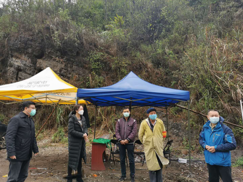 市地方志办党组成员、副主任凌琳(左2)、钱玉洲(右1)等到高兴村防疫监控点走访(黄志坚摄)