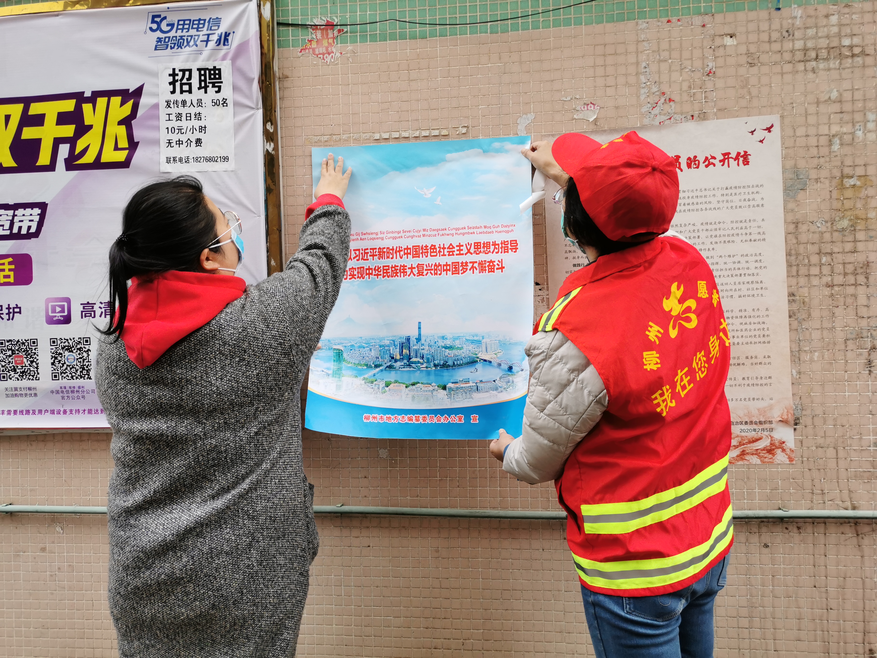 本办志愿者在社区张贴“创城”公益广告(吴思雯摄)