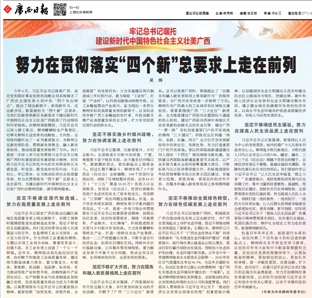 6月8日,《广西日报》理论版刊发柳州市委书记吴炜署名文章《努力在贯彻落实“四个新”总要求上走在前列》。文章称,柳州要进一步深入学习宣传贯彻习近平总书记视察广西时的重要讲话和重要指示精神,切实将习近平总书记和党中央的关怀厚爱转化为感党恩、听党话、跟党走的实际行动,不忘初心、牢记使命,全力推动经济社会高质量发展,努力在贯彻落实“四个新”总要求上走在前列,为建设新时代中国特色社会主义壮美广西作出柳州贡献、谱写柳州篇章。