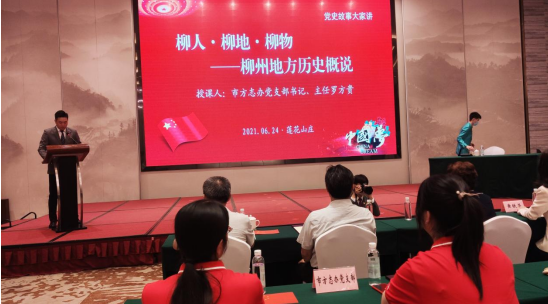 当天,参与活动的党员一同重温入党誓词,高唱红色歌曲《我们走在大路上》。随后,市方志办主任、党组书记、党支部书记罗方贵以《柳人·柳地·柳物——柳州地方历史概说》为题,简要讲述柳州之人、柳州政区和柳州风土等方面历史,以及在中国共产党领导下,全市各族人民砥砺前行,取得辉煌业绩的历程。