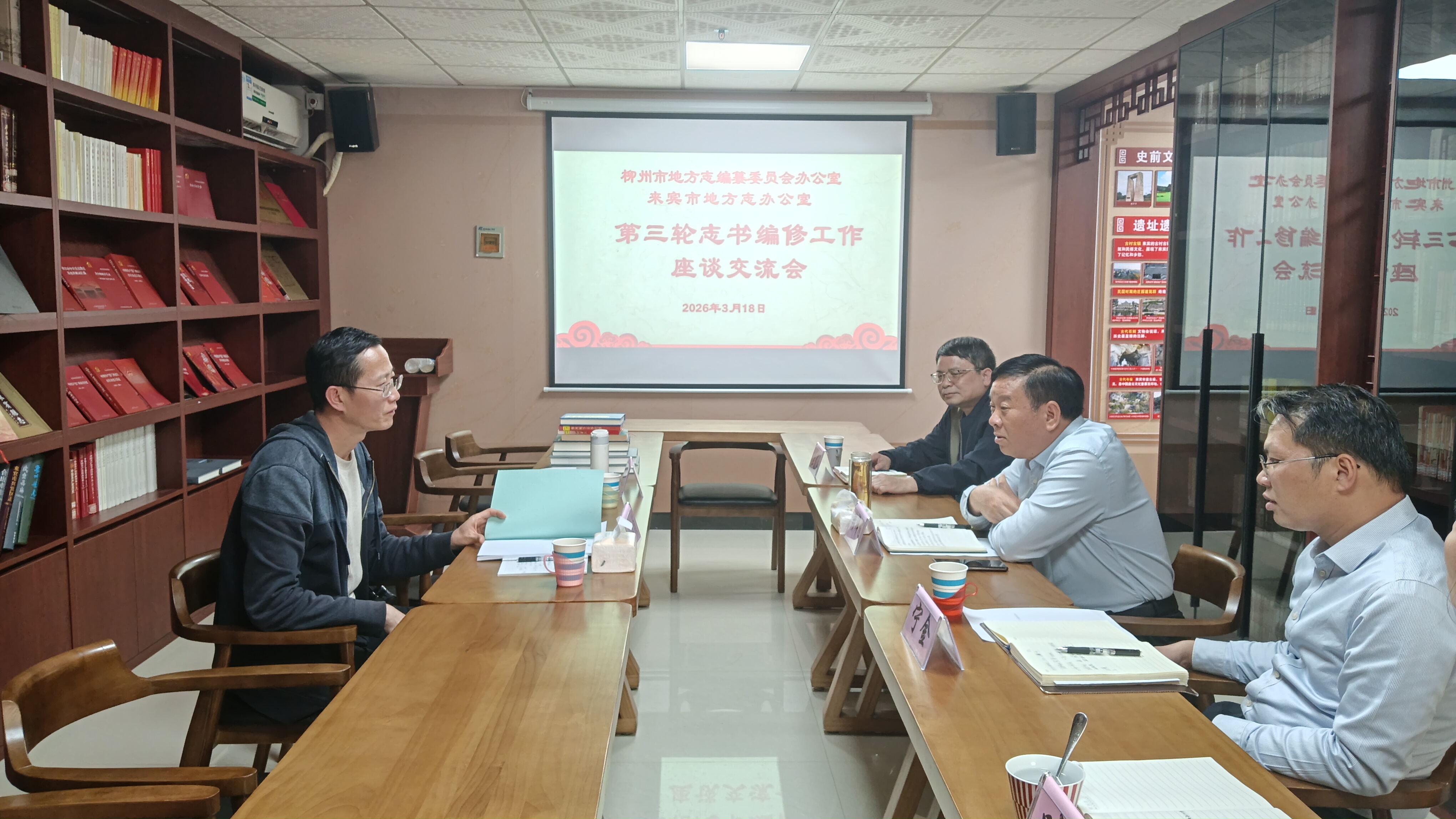 3月18日下午,柳州市地方志办副主任王骕颉(左)与来宾市地方志办主任赖旭辉(右二)及相关科室同志座谈交流。(熊春云摄)