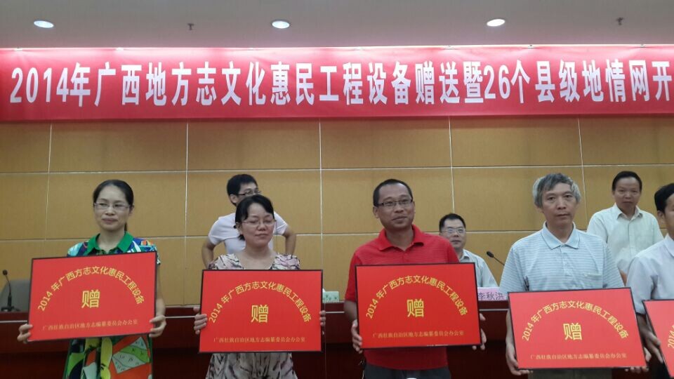 9月5日,广西地方志文化惠民工程设备赠送暨26个县级地情网开通仪式在南宁举行,我市的柳江县、融水苗族自治县获赠惠民设备,并开通了地情网站。至此,自治区地方志办公室已完成14个市55个县(市)地情网的建设,计划至2015年建成广西地方志系统网站群。