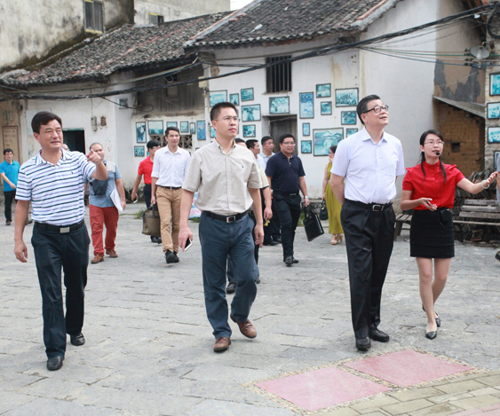 王鸿鹄(右四)陪同下考察柳城洛崖知青城。