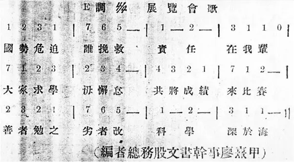 1932年3月,国民政府与日军签订屈辱的《淞沪停战协定》后,柳州的爱国官兵和各界进步人士等,发动群众参加抗日救亡宣传和抵制日货的活动,组织中学生成立晨呼队,于清晨6时在各街道晨跑时,高呼抗日救亡口号。1933年9月,柳州举办了一次教育成绩展览大会,总务股文书干事廖熹甲为此编写了会歌,开头一句就是“国势危亡谁挽救?责任在我辈”。