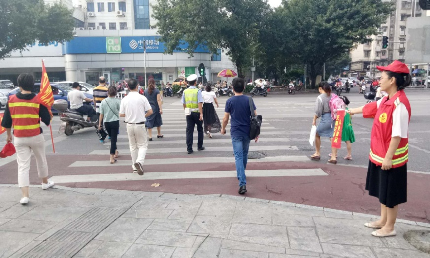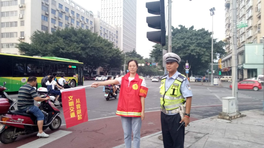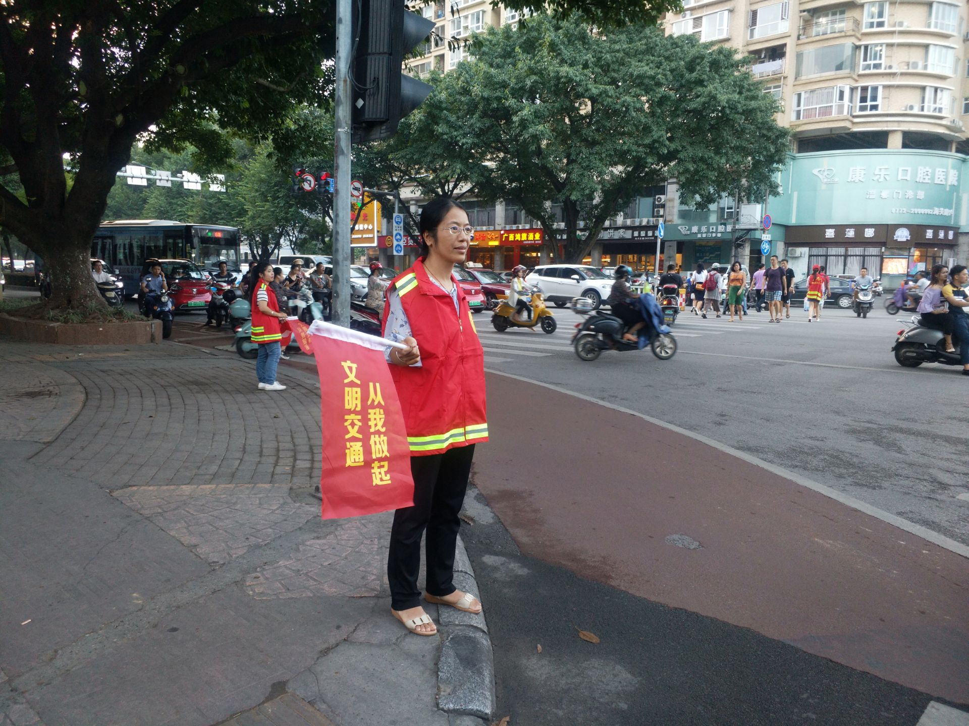 为全力配合我市“文明创建·助力创城”工作深入开展,进一步巩固文明交通成果,着力打造柳州有序、安全、文明的城市交通环境,提升我市文明形象,9月14日市方志办组织志愿者,在潭中东路海关路口参加文明交通劝导志愿服务活动。大家不畏日晒,身穿红马夹,头戴小红帽,拿着引导旗坚守在自己的岗位上。红灯亮时,伸臂挥旗,在斑马线前拦出一条安全线;绿灯亮时,旗指向通行方向,引导路人沿斑马线有序通行,及时制止不遵守交通法规的不文明行为,为我市创建文明城市贡献了自己的力量。(综合科图文)