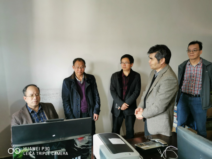 自治区地方志办公室党组书记、主任梁金荣(左一)在融水县史志研究室实地察看志鉴编修情况
