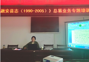 就如何作好审验后志稿的修订,指导组直接应答现场提问。随机抽看志稿,借助于面对面交流和投影演示示范志稿修志,由点及面,引带县志编纂人员做好细节把控,进一步优化志稿篇目架构,拓展资料收集、精准取材、突出主体特色,规范体例,简洁行文。在三江、融安两县史志办,业务指导和交流侧重以下几个方面:如何写好篇(章)之下的无题概述性导言,如何克服现有资料欠缺化零为整,如何避免混记而析统为分,如何把准记载主体、侧重点、记载角度和记载顺次,如何择选图片并拟好图片说明,如何实现表格规范化要求,如何简洁行文,等等。在融水史志办,针对其志稿近于定稿的实际,指导组侧重阅检志稿书前书后,就如何改好序言、凡例、后记,顾全编纂机构和人员署名,进一步调好篇目等具体问题,提出指导意见。