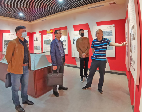 2022年5月25日,柳城县史志办负责人向市方志办主任何志忠(左二)一行介绍方志馆建设情况