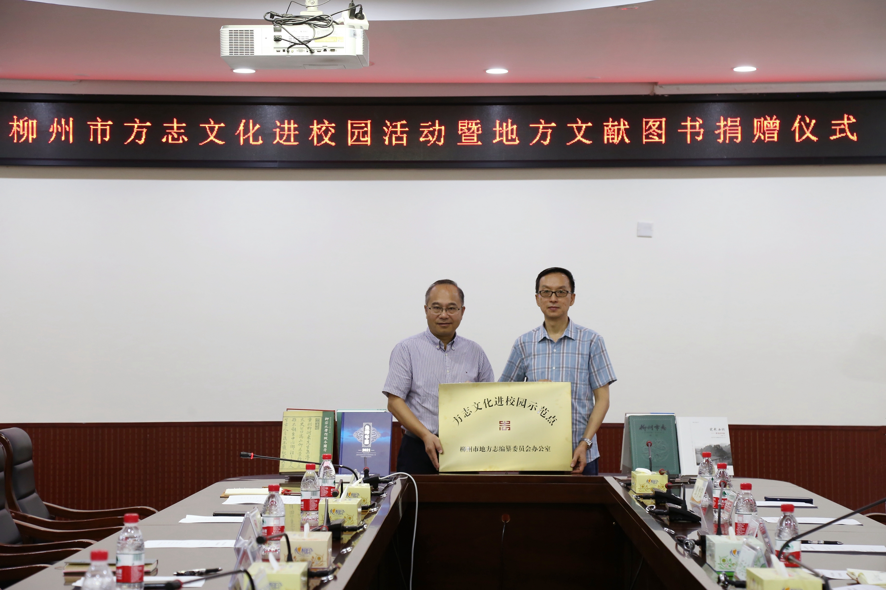 仪式上,市地方志办公室主任何志忠将“柳州市方志文化进校园活动示范点”牌匾交给柳州工学院党委书记罗云贵,柳州工学院副校长毛汉颖向参与赠书的市、县(区)地方志工作机构代表颁发了捐赠证书。