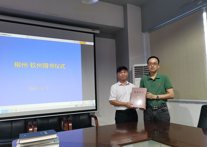 座谈结束后,市地方志办公室向钦州市地方志办公室赠送《柳州年鉴》《定影西线——黔桂老铁路》等书籍,钦州市地方志办公室回赠《钦州市志》《钦州白话》《钦州书院》等书籍。