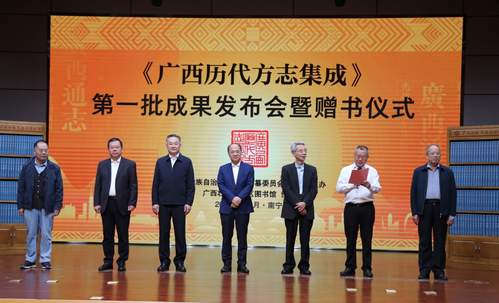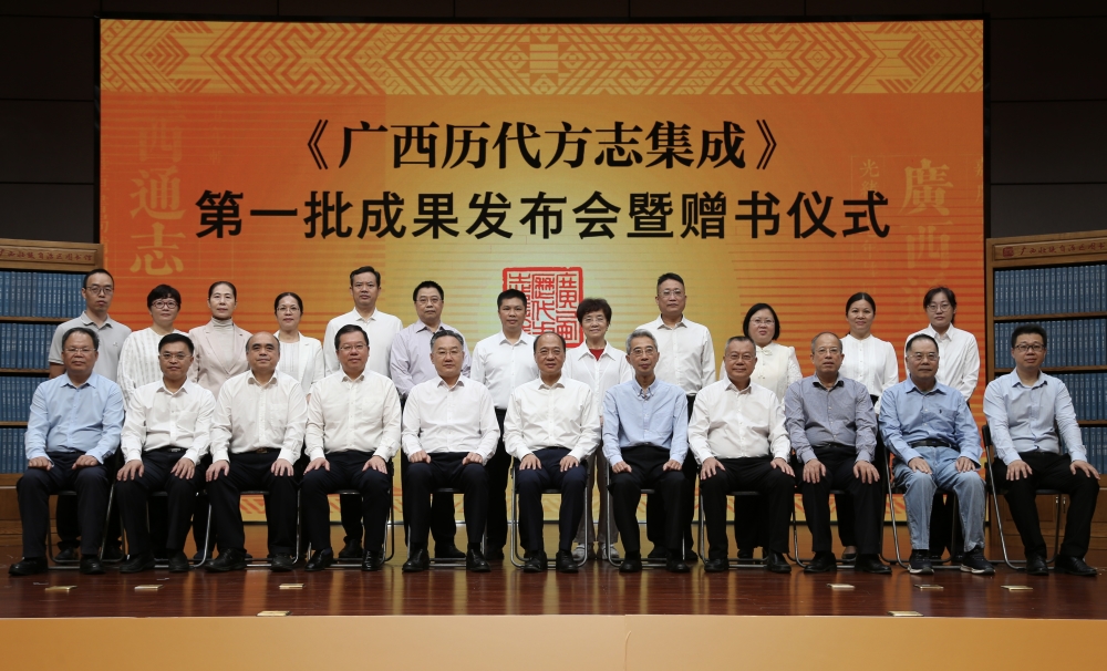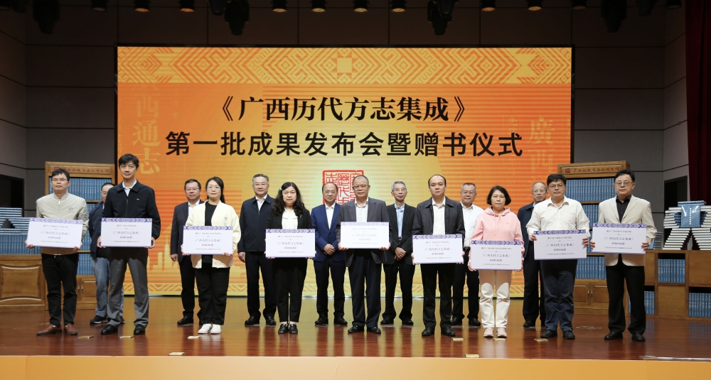 会上,廖品琥、邱新立、梁志强以及自治区党委宣传部副部长、自治区新闻出版局(版权局)局长、一级巡视员王晓华,广西师范大学党委书记贺祖斌,自治区政协提案委员会副主任梁金荣,自治区政府原参事李秋洪等领导分别向自治区档案馆、广西图书馆、广西博物馆等9家单位赠送《广西历代方志集成》第一批成果。