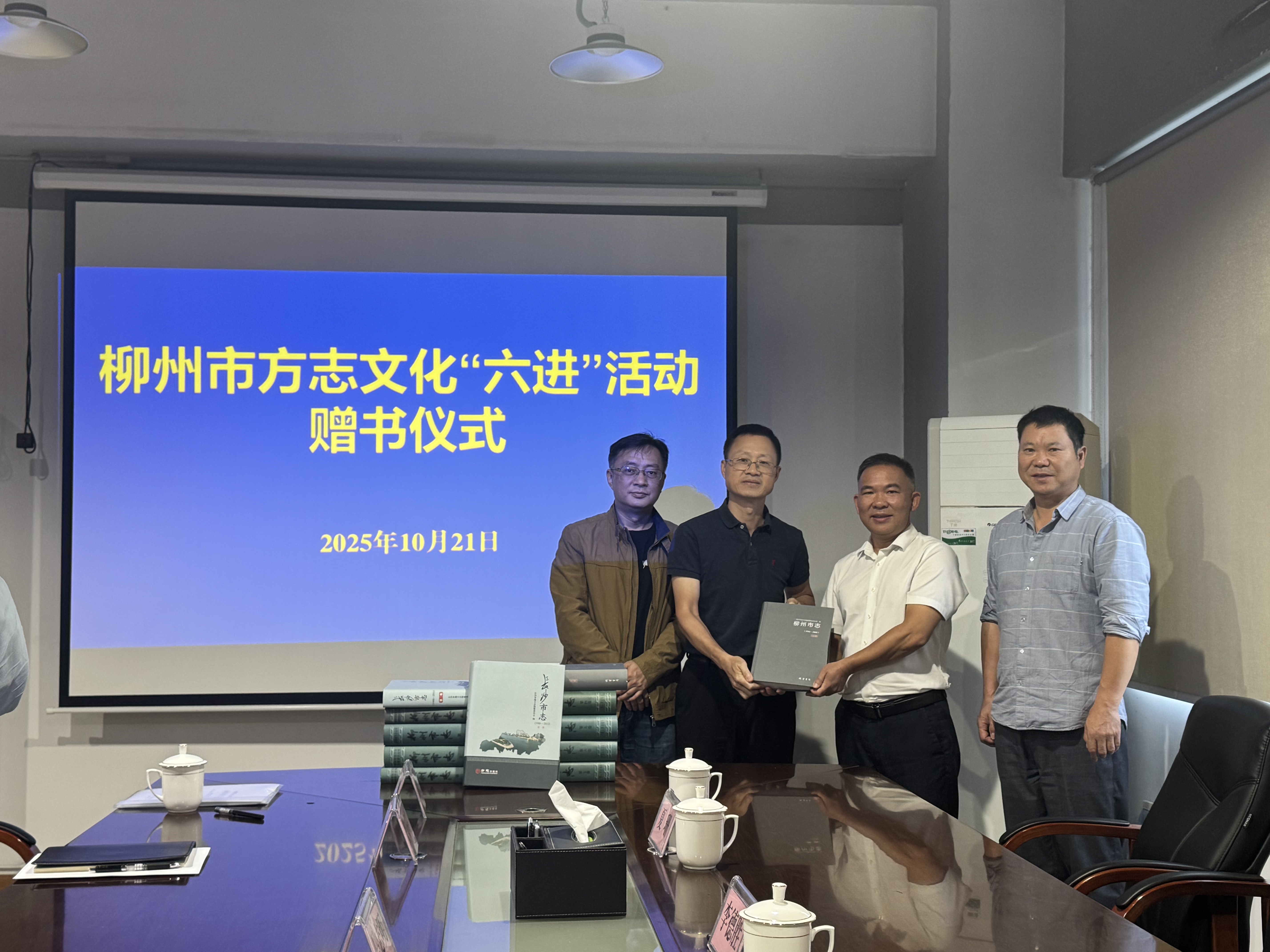 2025年10月21日,座谈会后,柳州市地方志办向长沙市地方志室赠送书籍。