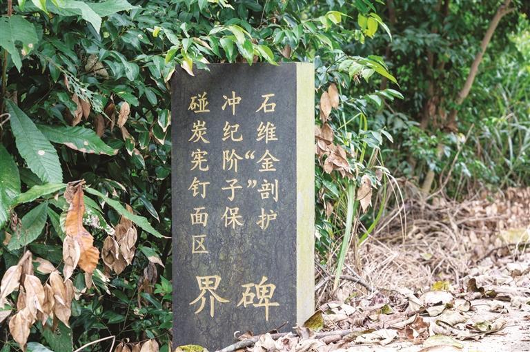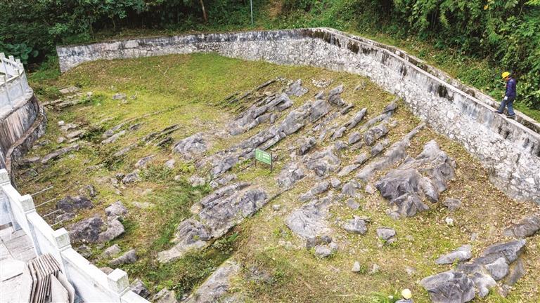 “金钉子”核心区观景台立着一块石碑,一面刻着“全球维宪阶金钉子 2008 VISEAIAN GSSP”,另一面刻着中英文标识“石炭系维宪阶全球标准层型剖面和点位”。落款显示,该石碑由自治区人民政府、柳州市政府、全国地层委员会于2015年7月共同设立。